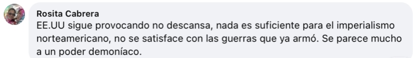 烏拉圭網(wǎng)友Rosita Cabrera:“美國(guó)一直在挑釁,不眠不休,對(duì)美帝國(guó)主義來(lái)說(shuō)什么都不夠,它不滿足于已經(jīng)發(fā)動(dòng)的那些戰(zhàn)爭(zhēng),它就是邪惡勢(shì)力?!?/p>