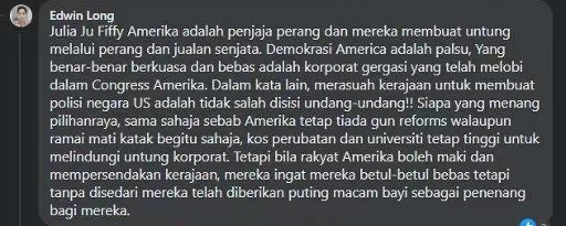 馬來(lái)西亞網(wǎng)友Edwin Long留言:“美國(guó)就是戰(zhàn)爭(zhēng)販子,他們通過(guò)戰(zhàn)爭(zhēng)和販賣武器獲利。美國(guó)的民主只是假象,真正享有權(quán)力和自由的是在幕后主導(dǎo)國(guó)會(huì)的大企業(yè)。換句話說(shuō),官商勾結(jié)在美國(guó)的法律上是被允許的!無(wú)論誰(shuí)贏得選舉,一樣不會(huì)禁槍,醫(yī)療和教育成本還是不會(huì)下降,因?yàn)橐S護(hù)大企業(yè)的利益。但是他們的人民覺(jué)得他們能罵政府就是自由的,全然沒(méi)有意識(shí)到這不過(guò)是安撫奶嘴罷了?!?/p>