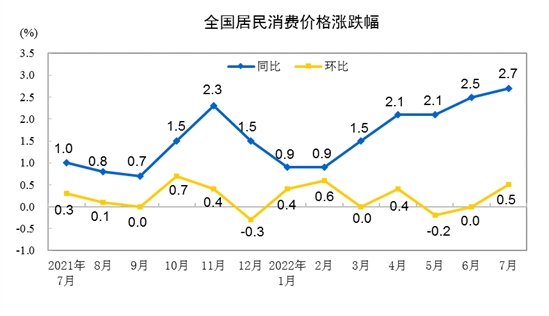 2022年7月份,全國居民消費(fèi)價(jià)格同比上漲2.7%。其中,城市上漲2.6%,農(nóng)村上漲3.0%;食品價(jià)格上漲6.3%,非食品價(jià)格上漲1.9%;消費(fèi)品價(jià)格上漲4.0%,服務(wù)價(jià)格上漲0.7%。1--—7月平均,全國居民消費(fèi)價(jià)格比上年同期上漲1.8%。