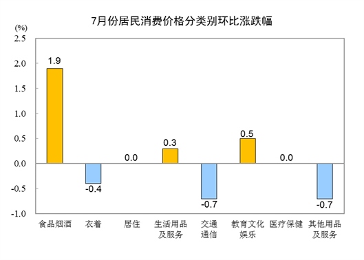 7月份,全國居民消費(fèi)價(jià)格環(huán)比上漲0.5%。其中,城市上漲0.4%,農(nóng)村上漲0.5%;食品價(jià)格上漲3.0%,非食品價(jià)格下降0.1%;消費(fèi)品價(jià)格上漲0.6%,服務(wù)價(jià)格上漲0.3%。