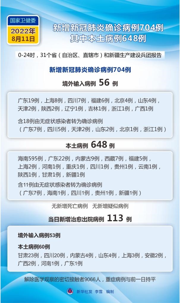 新華社北京8月12日電 國家衛(wèi)生健康委員會8月12日通報,8月11日0—24時,31個省(自治區(qū)、直轄市)和新疆生產(chǎn)建設兵團報告新增確診病例704例。其中境外輸入病例56例(廣東19例,上海8例,四川7例,福建6例,北京4例,山東4例,天津2例,陜西2例,遼寧1例,吉林1例,浙江1例,廣西1例),含18例由無癥狀感染者轉為確診病例(廣東7例,四川5例,天津2例,山東2例,北京1例,浙江1例);本土病例648例(海南595例,廣東22例,內蒙古9例,西藏7例,福建5例,上海2例,河南1例,重慶1例,四川1例,貴州1例,云南1例,陜西1例,甘肅1例,新疆1例),含11例由無癥狀感染者轉為確診病例(廣東7例,海南1例,四川1例,貴州1例,新疆1例)。無新增死亡病例。無新增疑似病例。