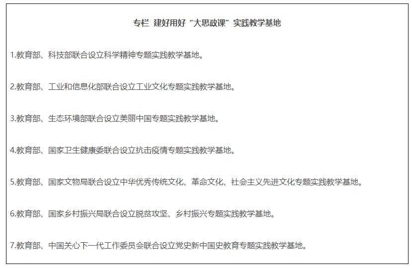 21.強化統(tǒng)籌協(xié)調(diào)。教育部、中央宣傳部做好“大思政課”建設的總體謀劃。中央網(wǎng)信辦指導做好“大思政課”全媒體宣傳??萍疾俊⒐I(yè)和信息化部、生態(tài)環(huán)境部、國家衛(wèi)生健康委、國家文物局、國家鄉(xiāng)村振興局、中國關心下一代工作委員會等部門,加強對基地的指導和建設,切實發(fā)揮好基地的育人功能。