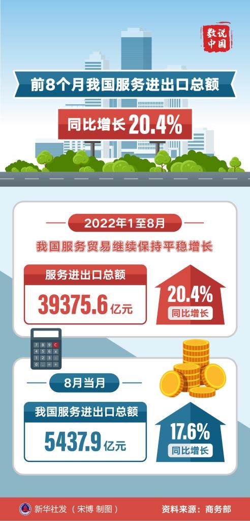 新華社北京10月12日電(記者謝希瑤)商務(wù)部12日公布數(shù)據(jù)顯示,今年1至8月,我國服務(wù)貿(mào)易繼續(xù)保持平穩(wěn)增長。服務(wù)進(jìn)出口總額39375.6億元,同比增長20.4%。