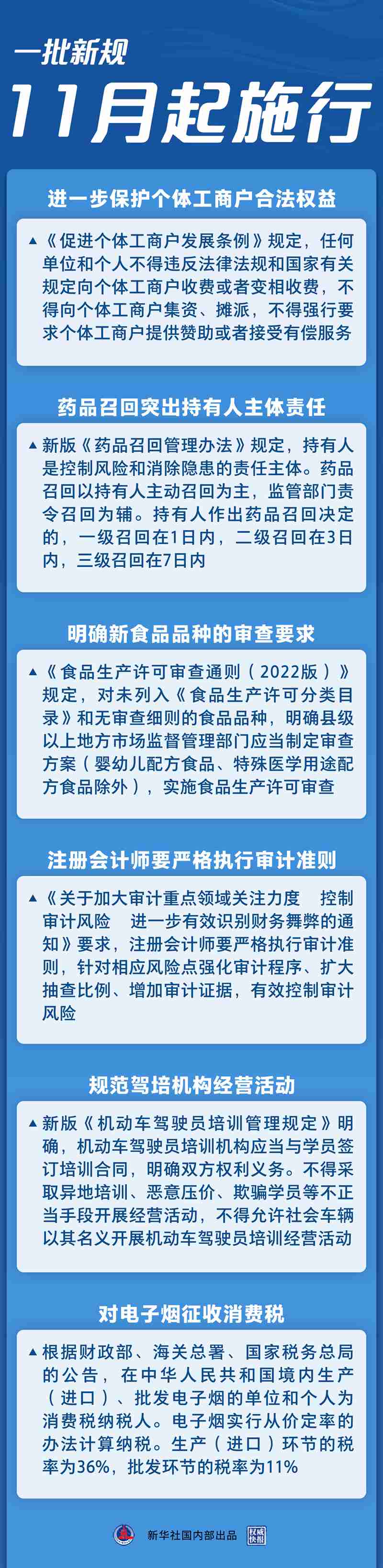 這個(gè)11月,一批民生新規(guī)開(kāi)始施行,影響社會(huì)生活諸多方面。保護(hù)個(gè)體工商戶合法權(quán)益、規(guī)范駕培機(jī)構(gòu)經(jīng)營(yíng)活動(dòng)、完善藥品召回分級(jí)制度……更完善的法治,讓你我更有獲得感。