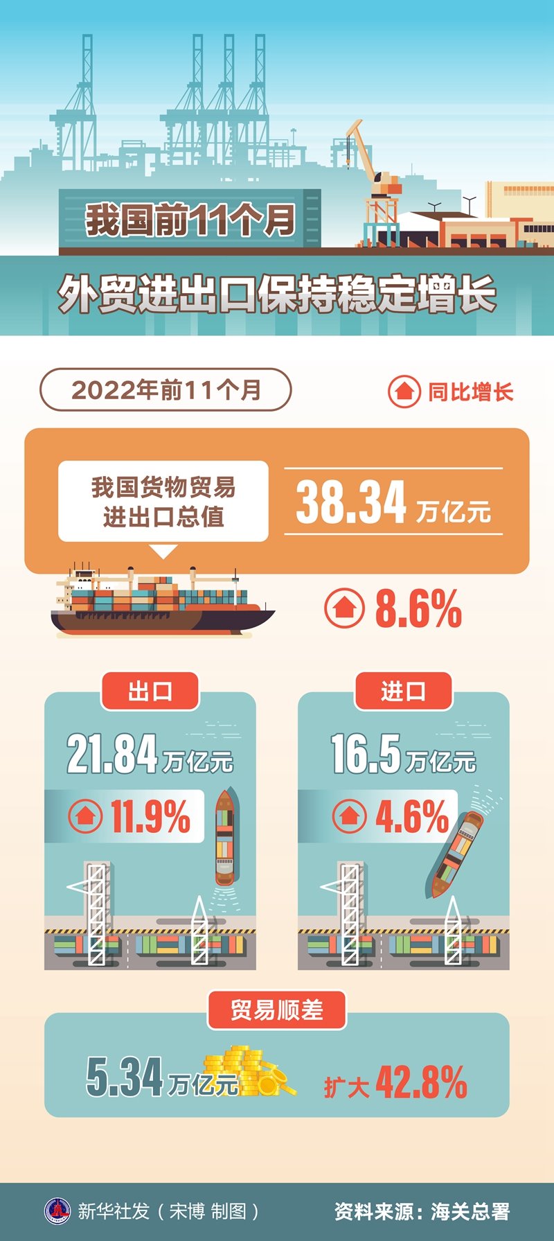 新華社北京12月7日電(記者鄒多為)海關總署7日發(fā)布數(shù)據(jù):今年前11個月,我國貨物貿易進出口總值38.34萬億元,同比增長8.6%。其中,出口21.84萬億元,增長11.9%;進口16.5萬億元,增長4.6%;貿易順差5.34萬億元,擴大42.8%。