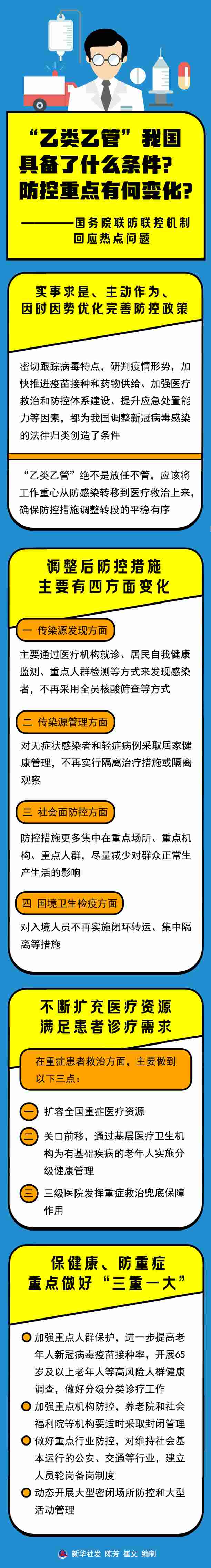 國(guó)家衛(wèi)生健康委疫情應(yīng)對(duì)處置工作領(lǐng)導(dǎo)小組專(zhuān)家組組長(zhǎng)梁萬(wàn)年說(shuō),“乙類(lèi)乙管”絕不是放任不管,應(yīng)該將工作重心從防感染轉(zhuǎn)移到醫(yī)療救治上來(lái),確保防控措施調(diào)整轉(zhuǎn)段的平穩(wěn)有序。