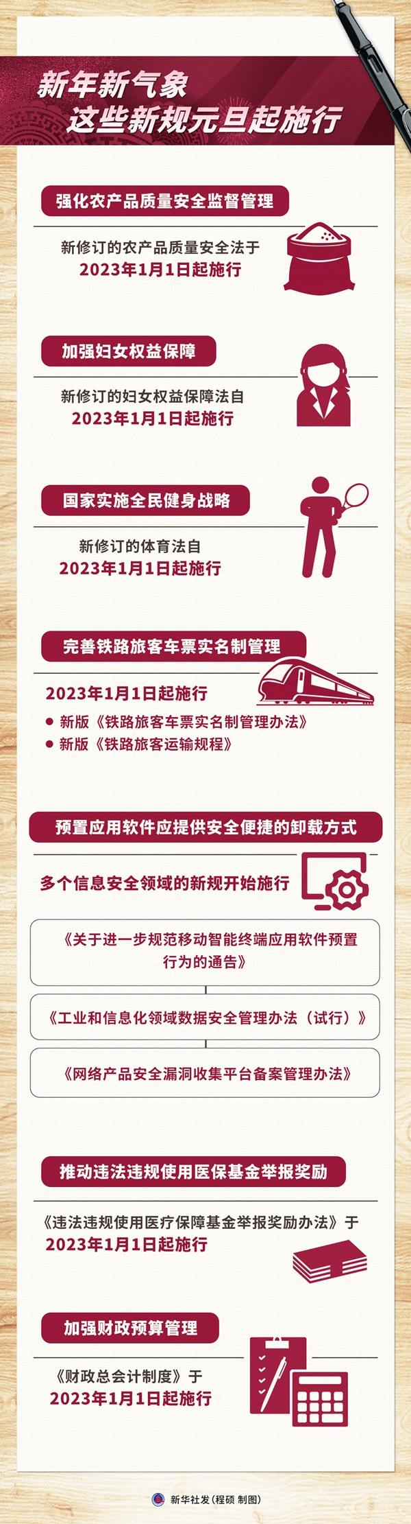 當(dāng)2023年的鐘聲敲響,一批元旦起施行的新規(guī),將為我們帶來新年新氣象。新修訂的農(nóng)產(chǎn)品質(zhì)量安全法全鏈條保障“舌尖上的安全”;新修訂的婦女權(quán)益保障法進(jìn)一步促進(jìn)男女平等;新修訂的體育法構(gòu)建全民健身公共服務(wù)體系……法治的溫度,彰顯社會的進(jìn)步。