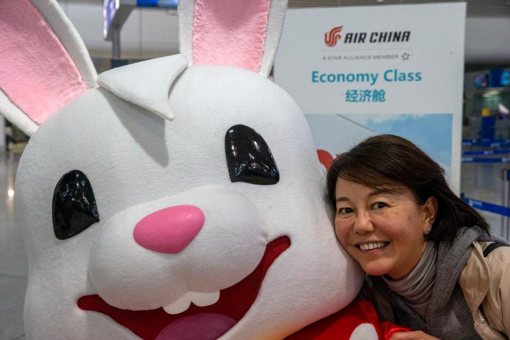 1月26日,在希臘雅典國際機場,一名準(zhǔn)備搭乘航班前往中國的乘客與裝扮成兔子造型的工作人員合影。(新華社發(fā),馬里奧斯·羅洛斯攝)