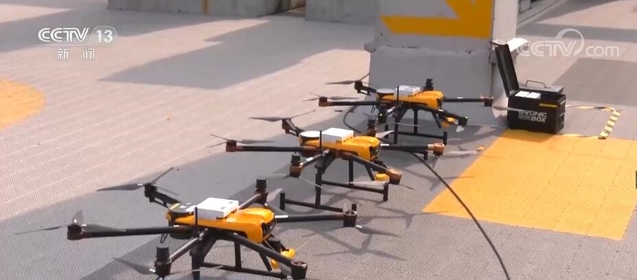 中午11點(diǎn),在深圳一家商場(chǎng)頂層的平臺(tái)上,一架架無(wú)人機(jī)整齊停放在“停機(jī)坪”,工作人員將傳送帶上的外賣(mài)掃碼、裝箱,再掛上無(wú)人機(jī)就準(zhǔn)備起飛。在幾公里外的目的地,有智能空投柜等待接收,降落后顧客憑取件碼取餐,方便安全。