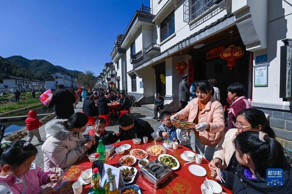 游客在浙江省建德市蓮花鎮(zhèn)戴家新村的百家宴上品嘗特色美食,感受新農(nóng)村“舌尖上的幸?!保?023年2月26日攝)。新華社記者 徐昱 攝