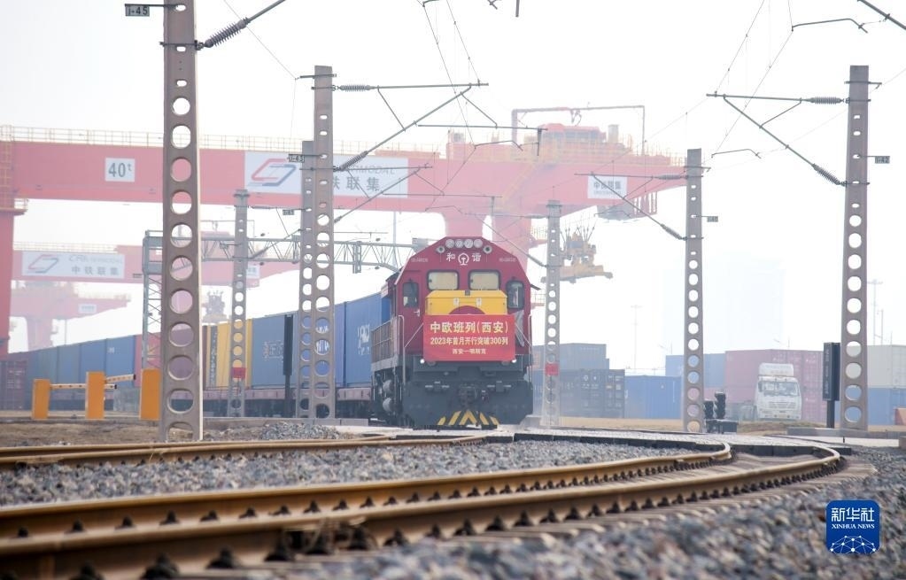 滿載日用百貨的X8151次中歐班列從西安國(guó)際港站駛出,開(kāi)往白俄羅斯首都明斯克(2023年2月1日攝)。新華社記者 李一博 攝