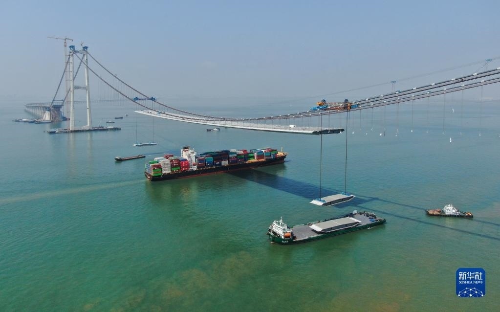 集裝箱貨輪通過(guò)正在吊裝鋼箱梁的深中通道伶仃洋大橋(2023年2月22日攝,無(wú)人機(jī)照片)。新華社記者 鄧華 攝