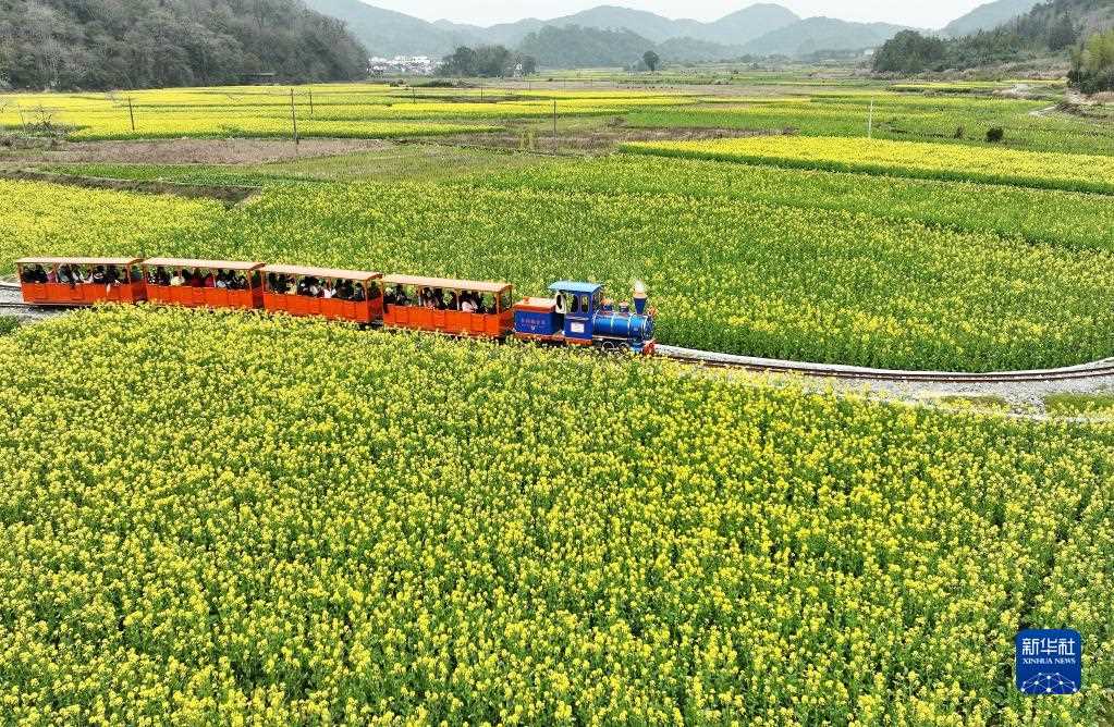 游客在江西省婺源縣嚴(yán)田景區(qū)乘坐“小火車”觀賞花海(3月3日攝,無(wú)人機(jī)照片)。