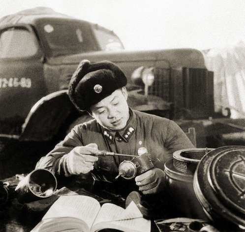 這是雷鋒(左三)向戰(zhàn)友傳授安全行車和節(jié)油的經(jīng)驗(yàn)(資料照片)。新華社發(fā)