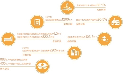 實(shí)實(shí)在在的舉措,帶來(lái)了實(shí)實(shí)在在的成效。城鄉(xiāng)學(xué)前教育公共服務(wù)體系基本建成,學(xué)前三年毛入園率由2011年的62.3%提高到2021年的88.1%。堅(jiān)持政府舉辦義務(wù)教育,九年義務(wù)教育鞏固率達(dá)95.5%,初中在校生5120.6萬(wàn)人,普通小學(xué)在校生10732.0萬(wàn)人;實(shí)施就業(yè)優(yōu)先戰(zhàn)略,確保就業(yè)局勢(shì)總體穩(wěn)定,2022年城鎮(zhèn)新增就業(yè)達(dá)1206萬(wàn)人,脫貧人口務(wù)工規(guī)模3278萬(wàn)人,100個(gè)城市公共就業(yè)服務(wù)機(jī)構(gòu)求人倍率為1.46,繼續(xù)保持在1以上,崗位供給大于求職人數(shù);著力解決群眾看病難、看病貴問(wèn)題,人民健康水平穩(wěn)步提升,全國(guó)共有醫(yī)療衛(wèi)生機(jī)構(gòu)103.3萬(wàn)個(gè),醫(yī)療衛(wèi)生機(jī)構(gòu)床位975萬(wàn)張,參加基本醫(yī)療保險(xiǎn)人數(shù)達(dá)到134570萬(wàn)人;不斷推進(jìn)養(yǎng)老事業(yè)和養(yǎng)老產(chǎn)業(yè)協(xié)同發(fā)展,養(yǎng)老服務(wù)體系更加健全,全國(guó)提供住宿的民政服務(wù)機(jī)構(gòu)中養(yǎng)老機(jī)構(gòu)達(dá)4.0萬(wàn)個(gè),民政服務(wù)床位中養(yǎng)老服務(wù)床位達(dá)822.3萬(wàn)張;加快推進(jìn)住房保障和供應(yīng)體系建設(shè),2022年全年全國(guó)各類(lèi)棚戶(hù)區(qū)改造開(kāi)工134萬(wàn)套,基本建成181萬(wàn)套,全國(guó)保障性租賃住房開(kāi)工建設(shè)和籌集265萬(wàn)套(間),群眾居住條件不斷改善;扎實(shí)做好因疫因?yàn)?zāi)遇困群眾和老弱病殘等特殊群體的基本生活保障,2022年年末,683萬(wàn)人享受城市最低生活保障,435萬(wàn)人享受農(nóng)村特困人員救助供養(yǎng),全年臨時(shí)救助1083萬(wàn)人次,保障網(wǎng)越織越密實(shí)。
