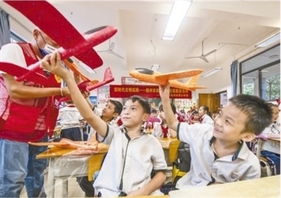 廣西壯族自治區(qū)梧州市的一所小學(xué)內(nèi),學(xué)生正在上趣味航??萍颊n。何華文攝(影像中國(guó))