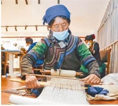 四川省涼山彝族自治州昭覺(jué)縣南坪社區(qū)的彝繡工坊內(nèi),易地扶貧搬遷到此的婦女在紡織布匹,就近就業(yè),實(shí)現(xiàn)穩(wěn)定脫貧。新華社記者 沈伯韓攝