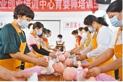 湖北省襄陽(yáng)市保康縣就業(yè)創(chuàng)業(yè)培訓(xùn)中心,學(xué)員在育嬰師培訓(xùn)班上練習(xí)新生兒護(hù)理技能。楊 韜攝(影像中國(guó))