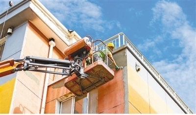 工人在內(nèi)蒙古自治區(qū)呼和浩特市玉泉區(qū)石東路街道一老舊小區(qū)改造升級(jí)現(xiàn)場(chǎng)進(jìn)行外墻真石漆施工作業(yè)。丁根厚攝(人民視覺(jué))