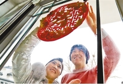 甘肅省張掖市臨澤縣鴨暖鎮(zhèn)屯泉小鎮(zhèn)彩蝶灣社區(qū),剛剛遷進(jìn)新居的村民在窗戶(hù)上貼窗花。王 將攝(影像中國(guó))