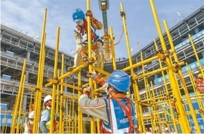 海南省建筑業(yè)職工職業(yè)技能競(jìng)賽暨質(zhì)量安全現(xiàn)場(chǎng)觀(guān)摩交流會(huì)現(xiàn)場(chǎng),建筑工人正在進(jìn)行架體搭設(shè)競(jìng)賽??档橇軘z(影像中國(guó))