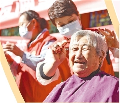 河北省唐山市豐潤(rùn)區(qū)燕山路街道欣園社區(qū),志愿者為老人免費(fèi)理發(fā)。朱大勇攝(人民視覺(jué))