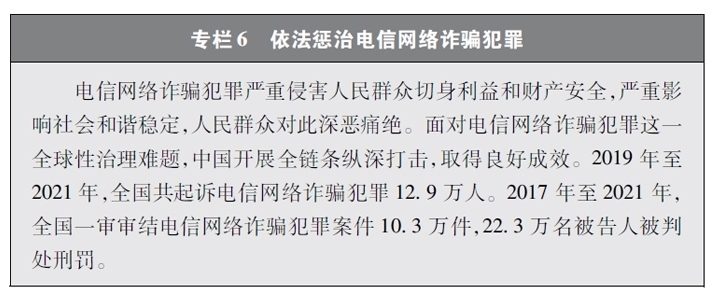 加大網(wǎng)絡(luò)犯罪懲治力度。隨著互聯(lián)網(wǎng)技術(shù)的快速發(fā)展,傳統(tǒng)犯罪加速向以互聯(lián)網(wǎng)為媒介的非接觸式犯罪轉(zhuǎn)變,電信網(wǎng)絡(luò)詐騙、網(wǎng)絡(luò)賭博、網(wǎng)絡(luò)淫穢色情等涉網(wǎng)違法犯罪多發(fā)。中國依法辦理新型網(wǎng)絡(luò)犯罪案件。連續(xù)多年開展“凈網(wǎng)行動(dòng)”,嚴(yán)厲打擊群眾反映強(qiáng)烈的黑客攻擊破壞、侵犯公民個(gè)人信息等違法犯罪活動(dòng)。持續(xù)推進(jìn)“云劍”“斷卡”“斷流”“拔釘”等專項(xiàng)行動(dòng),打擊套路貸、校園貸、“以房養(yǎng)老”、“投資養(yǎng)老”等電信網(wǎng)絡(luò)詐騙犯罪,依法懲處為電信網(wǎng)絡(luò)詐騙犯罪團(tuán)伙提供互聯(lián)網(wǎng)接入、域名注冊(cè)、服務(wù)器托管、移動(dòng)互聯(lián)網(wǎng)應(yīng)用程序制作開發(fā)、網(wǎng)絡(luò)支付、引流推廣等服務(wù)支撐的黑灰產(chǎn)業(yè)。完善國家反詐大數(shù)據(jù)平臺(tái)和反詐移動(dòng)互聯(lián)網(wǎng)應(yīng)用程序,建設(shè)國家涉詐黑樣本庫,完善快速止付凍結(jié)機(jī)制、涉詐資金返還機(jī)制。堅(jiān)決打擊網(wǎng)絡(luò)賭博犯罪行為,從嚴(yán)治理網(wǎng)絡(luò)淫穢色情。網(wǎng)絡(luò)犯罪治理工作取得明顯成效,人民群眾安全感有效提升,社會(huì)更加和諧穩(wěn)定。
