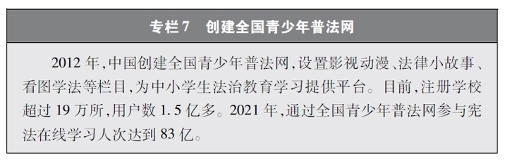 加強(qiáng)青少年網(wǎng)絡(luò)法治宣傳教育。青少年是祖國的未來、民族的希望。青少年網(wǎng)民在中國網(wǎng)民中的占比逐步增長。作為互聯(lián)網(wǎng)的“原住民”,青少年是網(wǎng)上學(xué)習(xí)、交流、生活最活躍的參與者、實(shí)踐者,其合法權(quán)益也更易受到網(wǎng)絡(luò)違法活動(dòng)的侵害。中國從保護(hù)青少年網(wǎng)絡(luò)權(quán)益,促進(jìn)青少年健康成長、全面發(fā)展出發(fā),遵循青少年身心發(fā)展規(guī)律,貼近青少年學(xué)習(xí)生活實(shí)際,聚焦網(wǎng)絡(luò)沉迷、網(wǎng)絡(luò)欺凌、網(wǎng)絡(luò)淫穢色情信息等重點(diǎn)問題,通過普法微綜藝、兒童普法話劇、網(wǎng)絡(luò)普法故事廣播、網(wǎng)絡(luò)普法云課堂、學(xué)法用法知識(shí)競(jìng)賽、法治副校長進(jìn)校園、編寫網(wǎng)絡(luò)普法讀本等生動(dòng)活潑、豐富多彩的形式開展法治宣傳教育,逐步形成了政府、社會(huì)、學(xué)校、家庭相結(jié)合的法治宣傳教育格局,為提升青少年網(wǎng)民法治意識(shí)和網(wǎng)絡(luò)安全素養(yǎng)提供了全面保障。