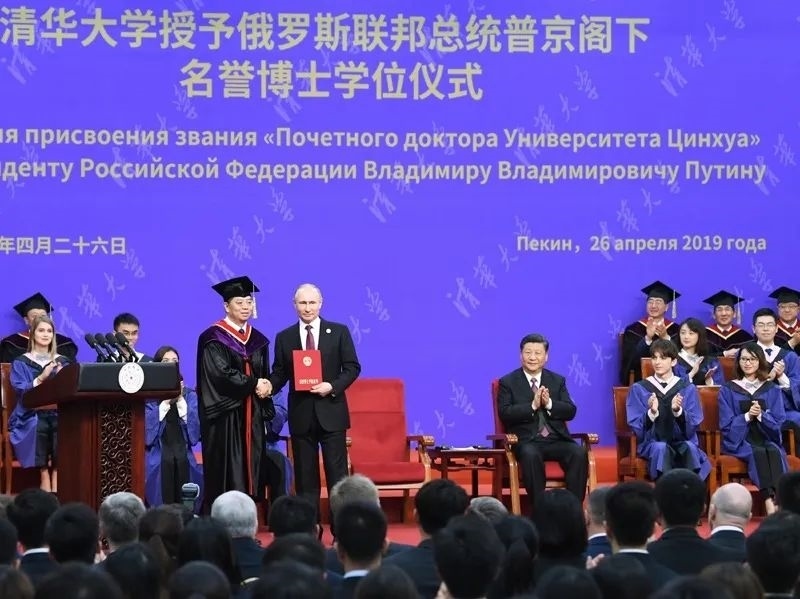 2019年4月,普京總統(tǒng)率團來華,出席第二屆“一帶一路”國際合作高峰論壇。期間,在北京友誼賓館,中方還有一項特殊安排:清華大學(xué)向普京總統(tǒng)授予名譽博士學(xué)位。
