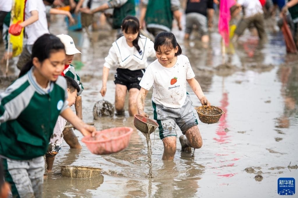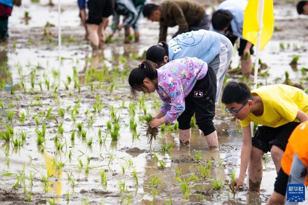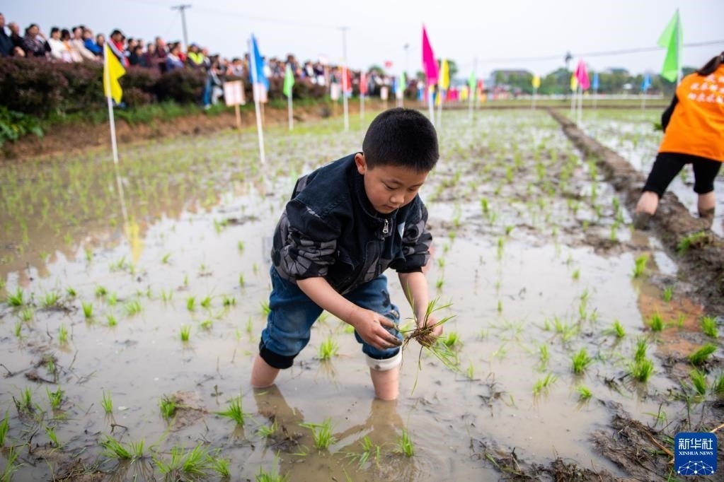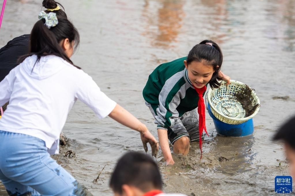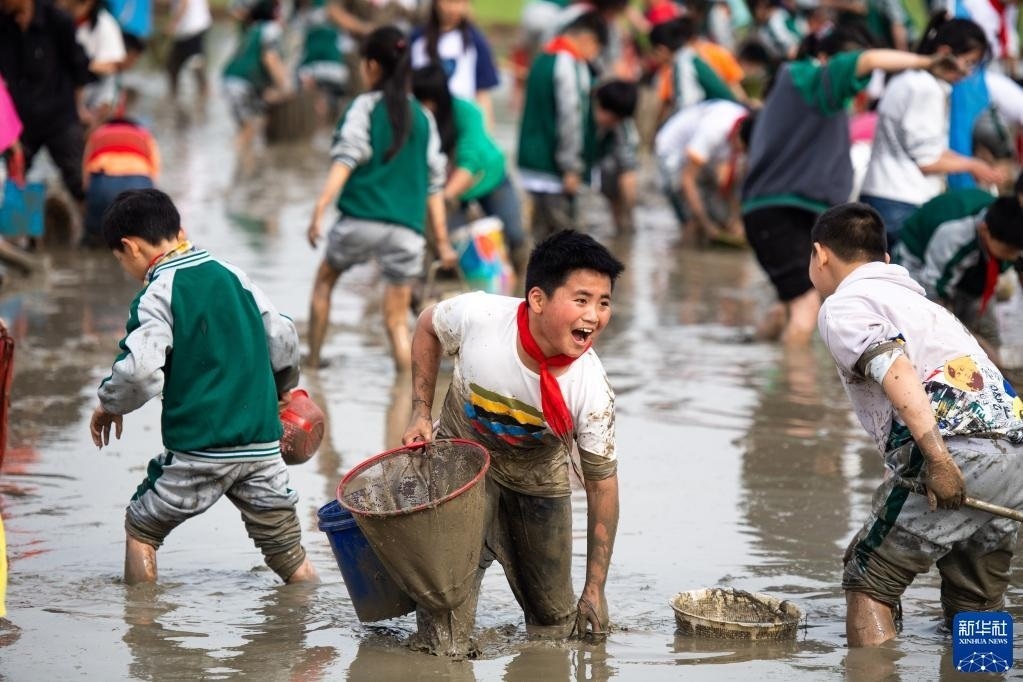 當(dāng)日,在湖南省長(zhǎng)沙市寧鄉(xiāng)市灰湯鎮(zhèn)花果山村舉行的農(nóng)耕民俗文化節(jié)學(xué)生研學(xué)活動(dòng)中,孩子們通過(guò)開(kāi)展稻田插秧、捉泥鰍等“農(nóng)趣” 比賽,走進(jìn)田間地頭,感受勞動(dòng)帶來(lái)的艱辛與快樂(lè)。新華社記者 陳思汗 攝