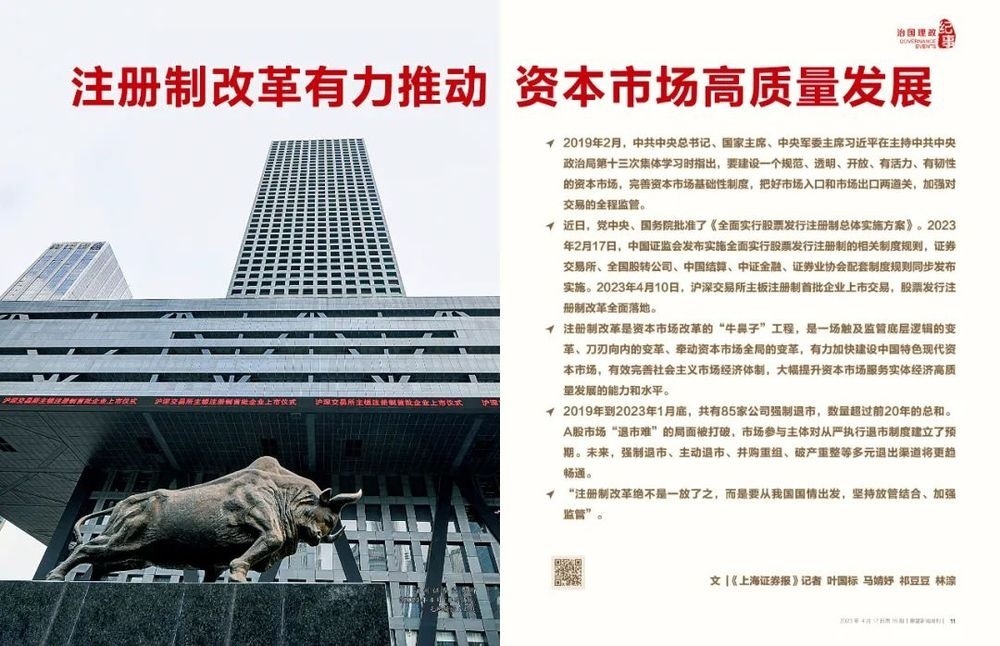 ◆ 注冊制改革是資本市場改革的“牛鼻子”工程,是一場觸及監(jiān)管底層邏輯的變革、刀刃向內的變革、牽動資本市場全局的變革,有力加快建設中國特色現(xiàn)代資本市場,有效完善社會主義市場經濟體制,大幅提升資本市場服務實體經濟高質量發(fā)展的能力和水平。