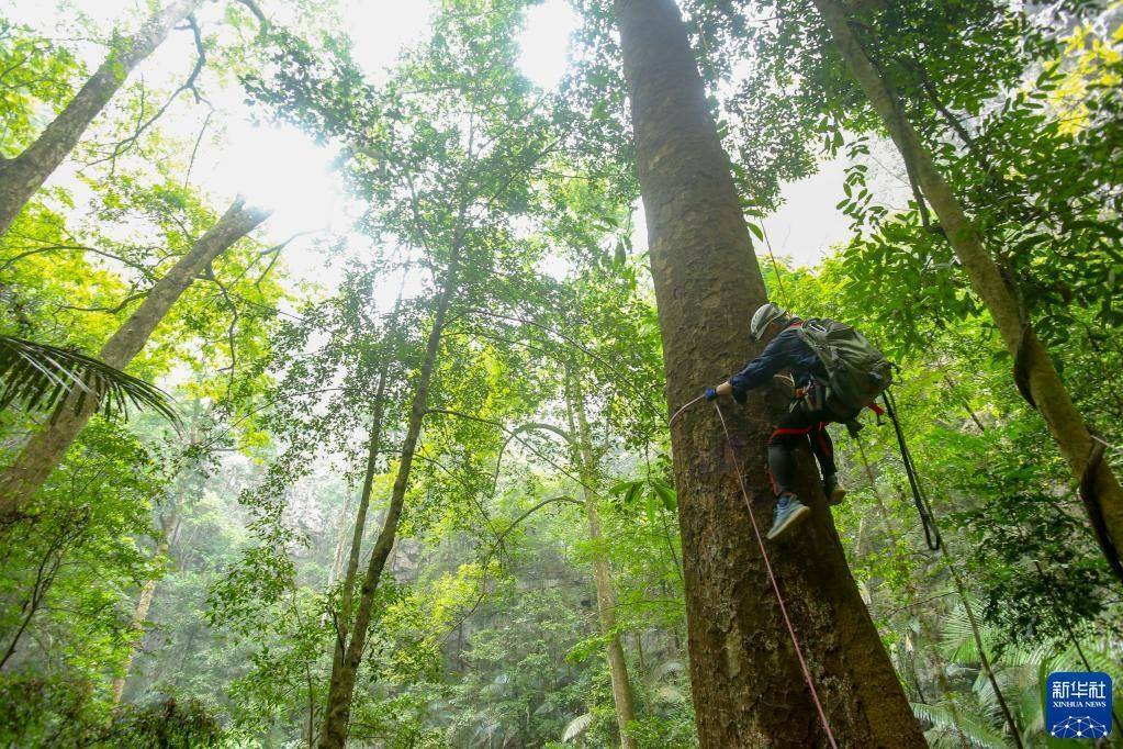 3月15日,南寧藍天救援隊的黃賢銘在攀爬望天樹,準備安裝測量樹高的超聲波信標。