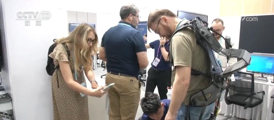 在新設(shè)的工業(yè)自動(dòng)化及智能制造新展區(qū),一位在剛果(金)經(jīng)營礦場(chǎng)的采購商正在試穿一款外骨骼產(chǎn)品,這款智能設(shè)備可以幫助實(shí)現(xiàn)減輕30%到70%的負(fù)重。