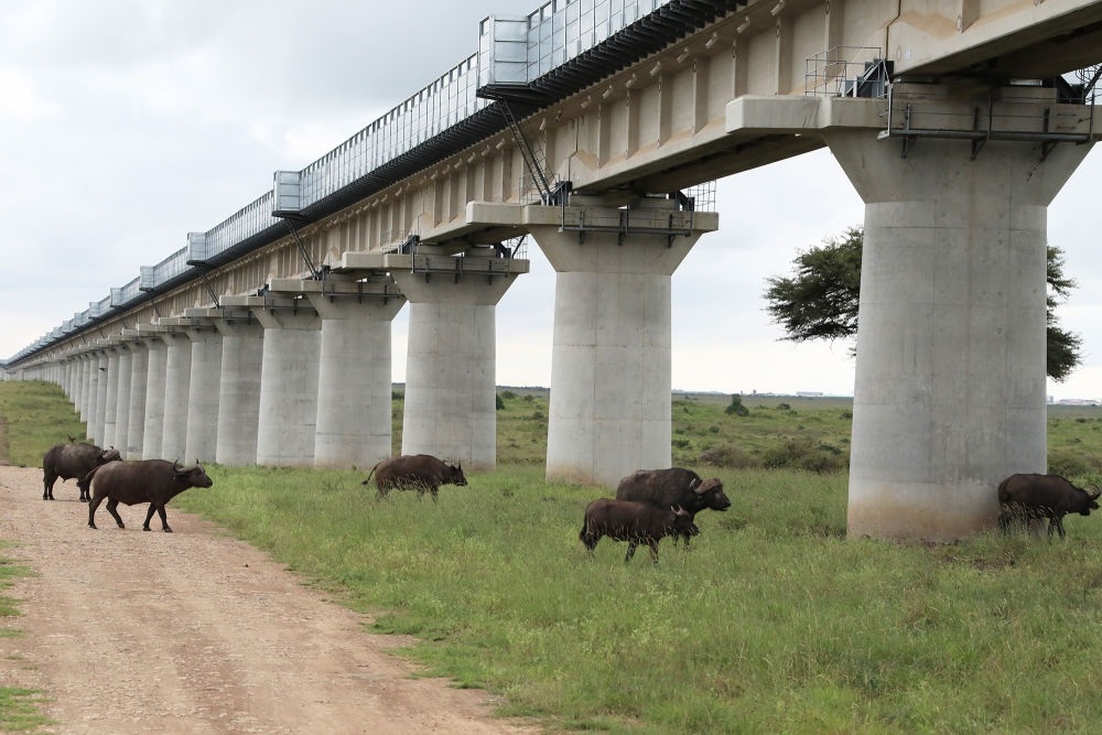 水牛在裝有聲屏障的肯尼亞內(nèi)羅畢國(guó)家公園特大橋下穿行(2021年5月19日攝)。中非共建的肯尼亞內(nèi)馬鐵路采用特大橋全程穿越內(nèi)羅畢國(guó)家公園方案,橋墩超過6米,讓長(zhǎng)頸鹿也能“昂首通過”;特大橋護(hù)欄兩側(cè)安裝聲屏障,極大降低火車通過時(shí)的噪音。