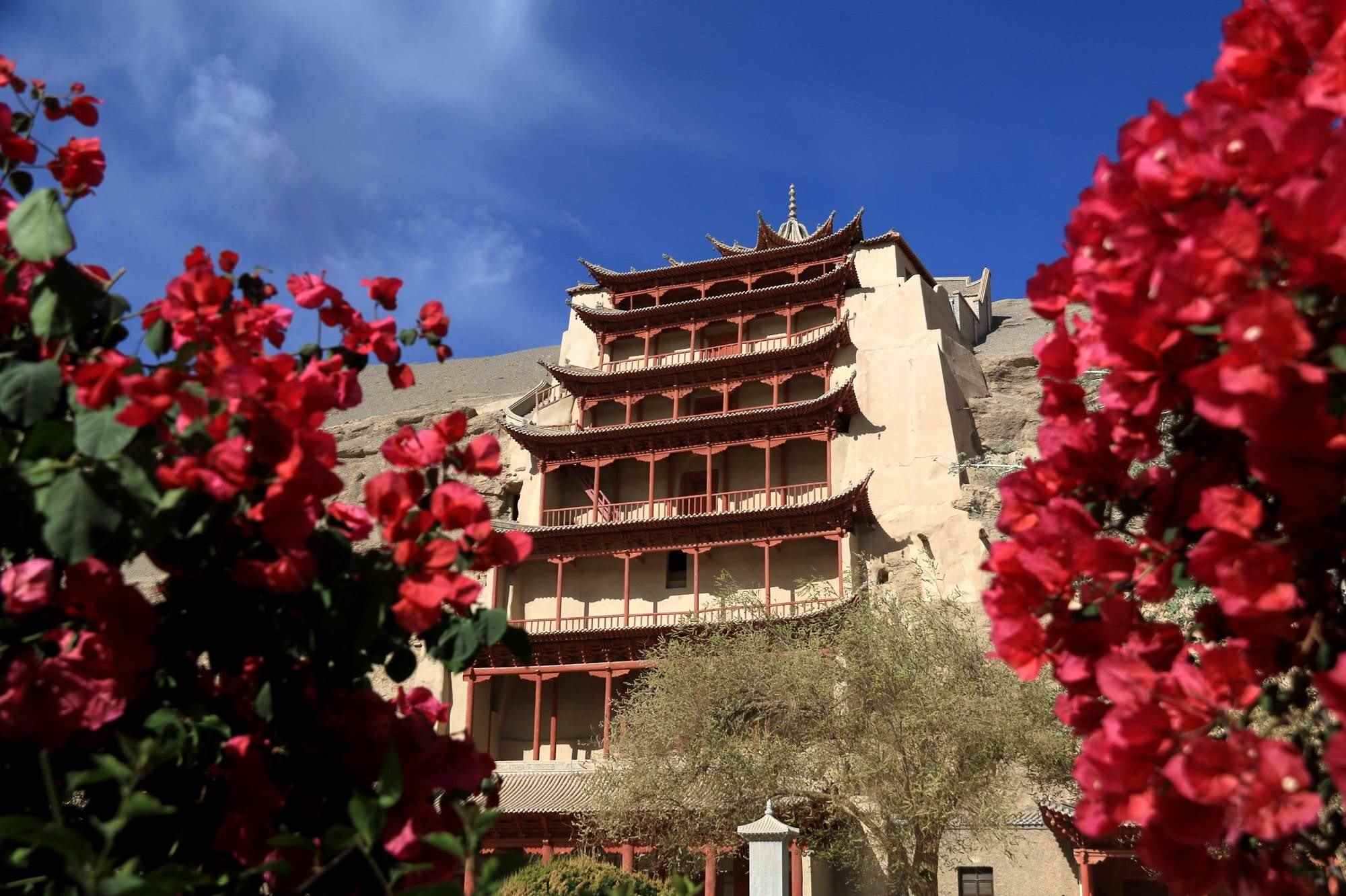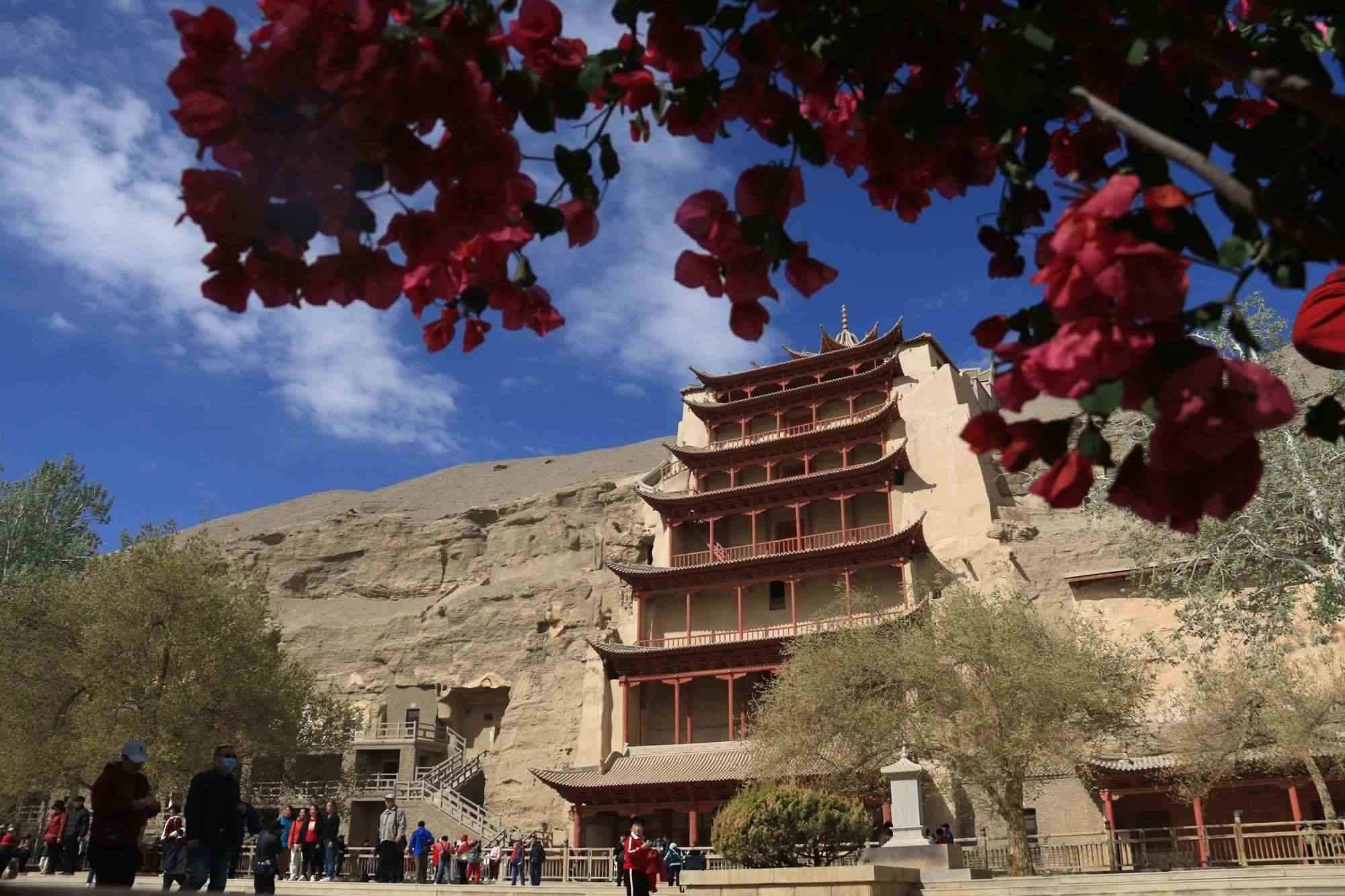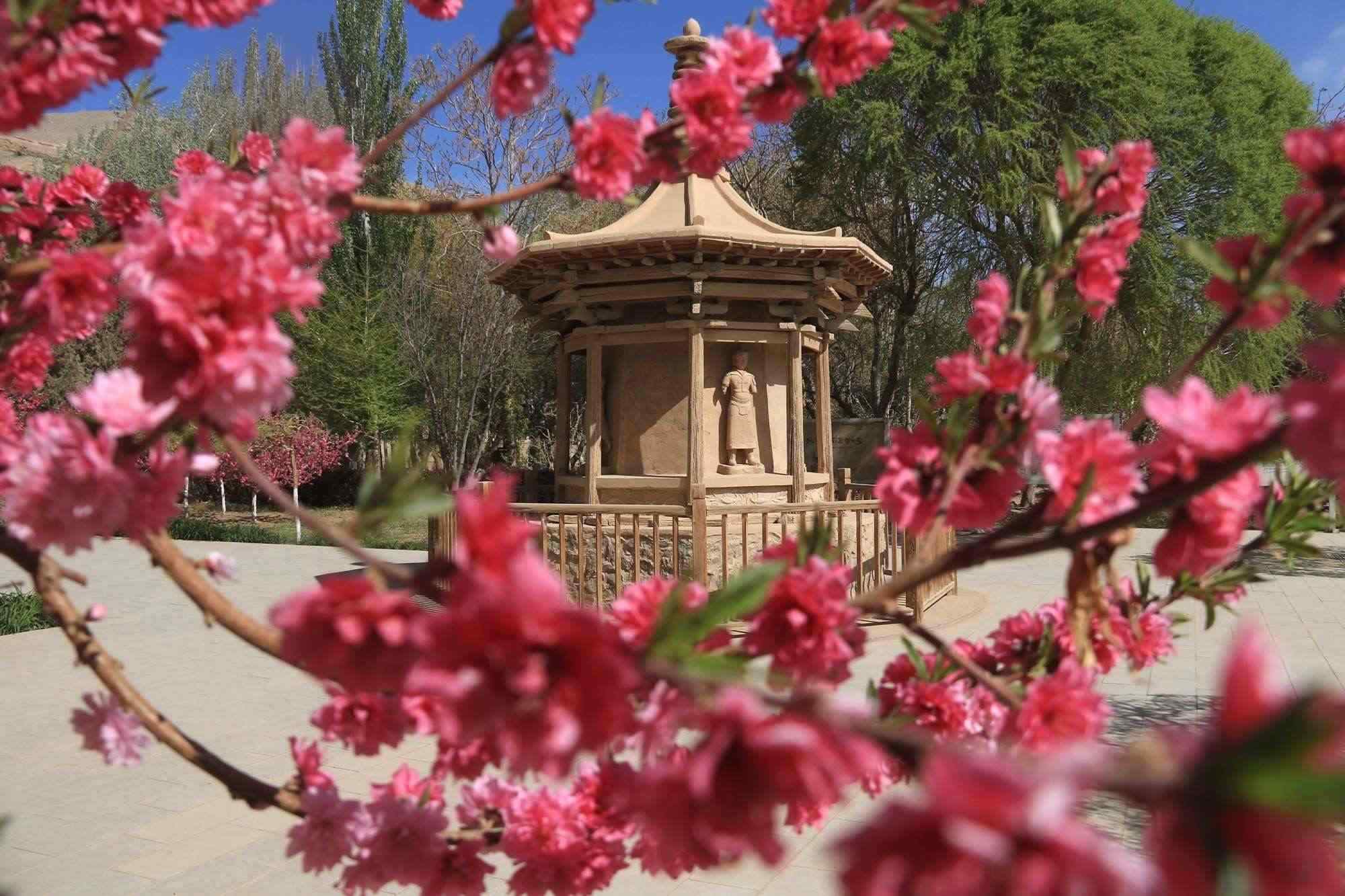 2023年4月27日,甘肅酒泉,敦煌市莫高窟景區(qū)的桃花、三角梅競相綻放,游人賞景賞花,樂在其中。視覺中國