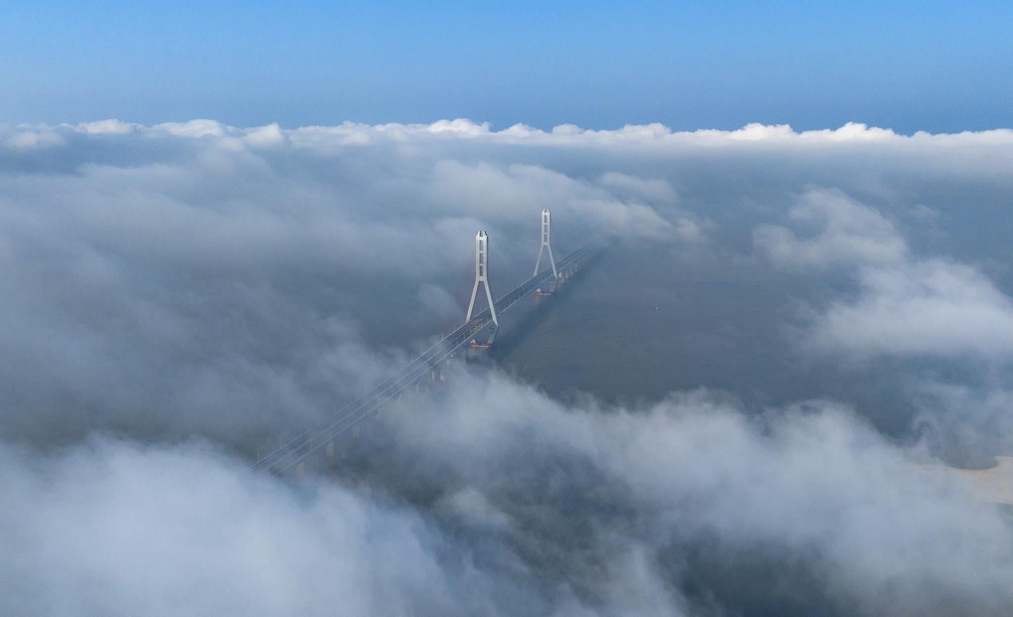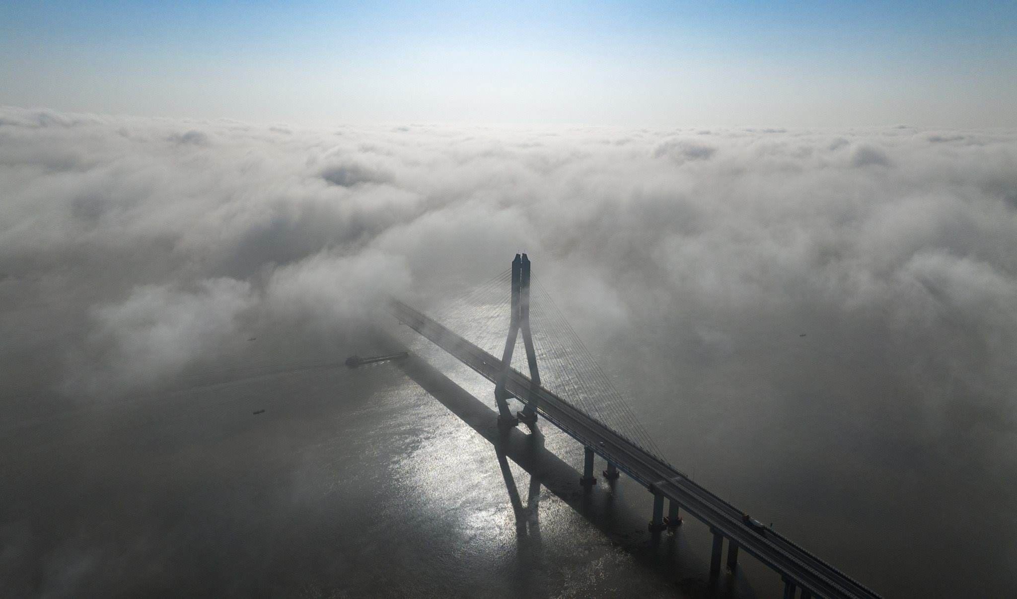 江西九江現(xiàn)平流霧景觀 鄱陽(yáng)湖二橋若隱若現(xiàn)