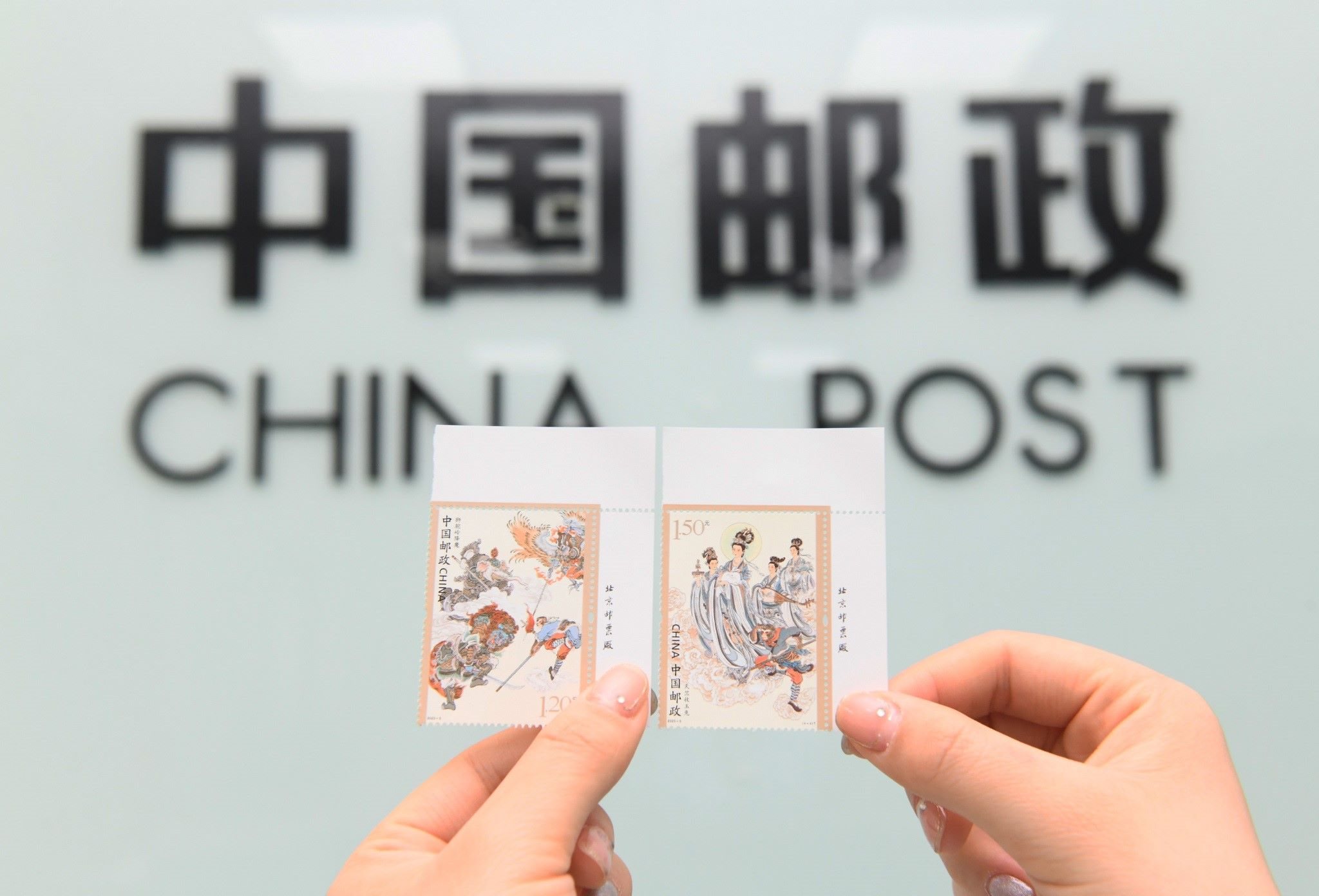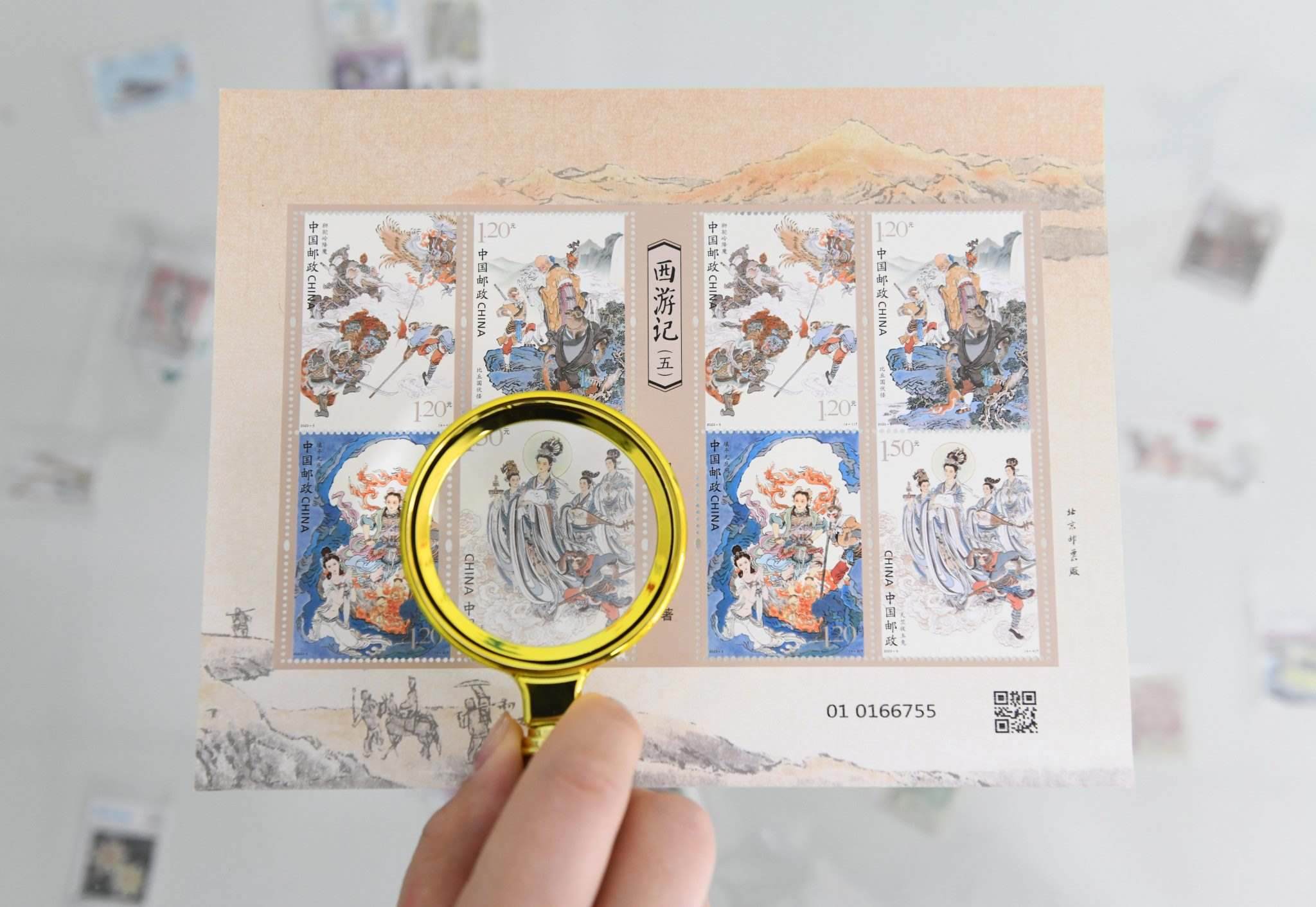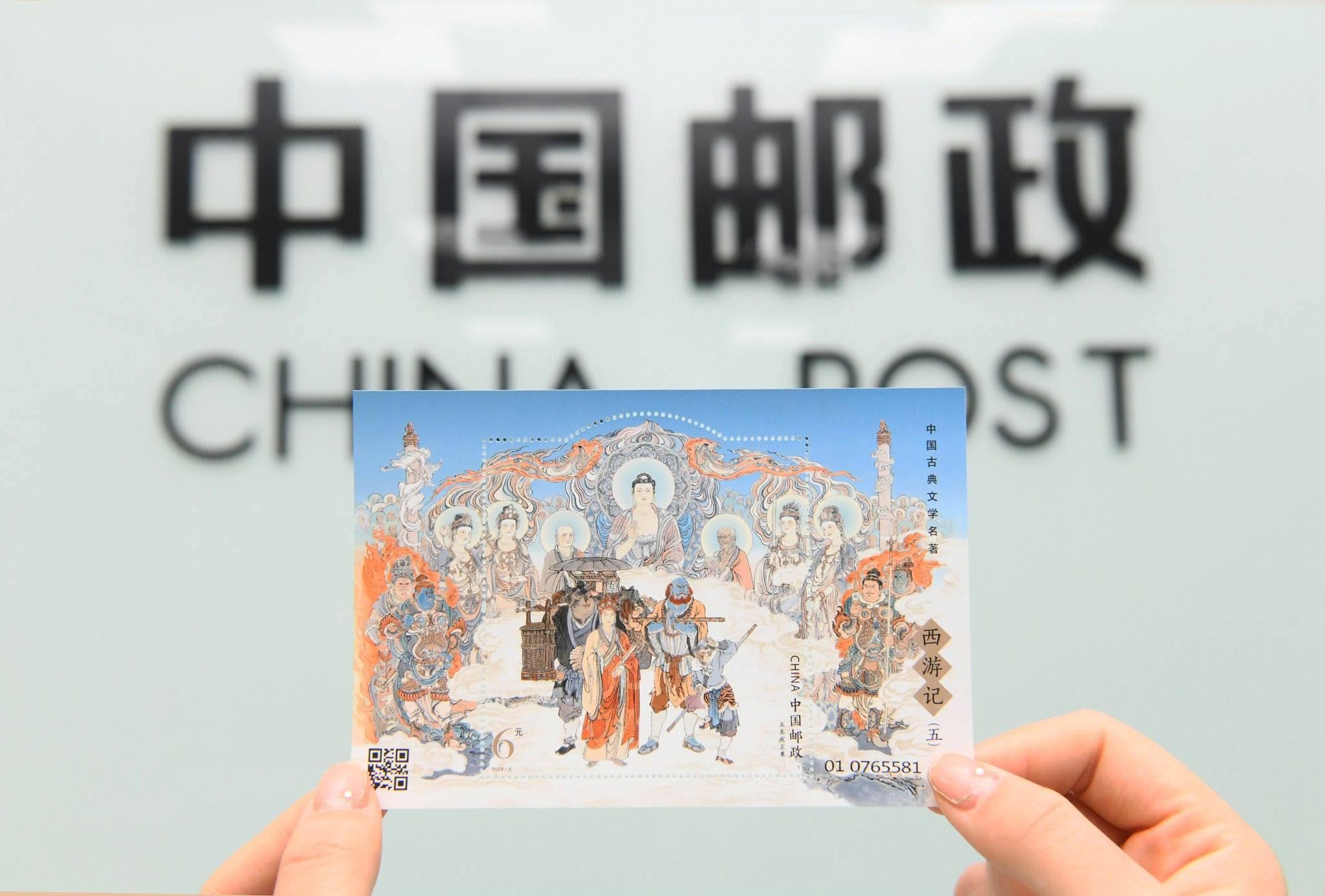 2023年4月27日,中國郵政集團(tuán)公司河北省新樂市分公司,工作人員展示發(fā)行的《中國古典文學(xué)名著—<西游記>(五)》特種郵票。視覺中國