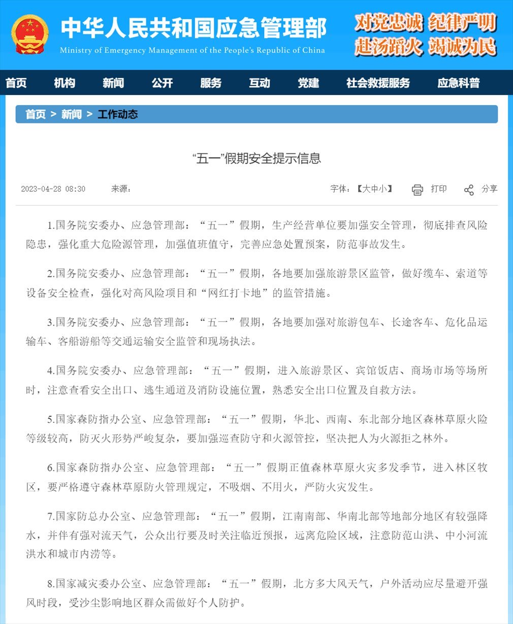 1.國務(wù)院安委辦、應(yīng)急管理部:“五一”假期,生產(chǎn)經(jīng)營單位要加強(qiáng)安全管理,徹底排查風(fēng)險(xiǎn)隱患,強(qiáng)化重大危險(xiǎn)源管理,加強(qiáng)值班值守,完善應(yīng)急處置預(yù)案,防范事故發(fā)生。