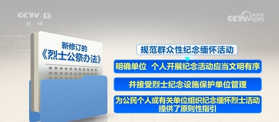 新修訂的《烈士公祭辦法》自5月1日起施行。其中,強調(diào)發(fā)揮公祭活動對青少年的教育作用,要求各級各類學校組織學生以適當方式參加烈士公祭,加強愛國主義、集體主義、社會主義教育。規(guī)范群眾性紀念緬懷活動,明確單位、個人開展紀念活動應當文明有序,并接受烈士紀念設施保護單位管理,為公民個人或有關單位組織紀念緬懷烈士活動提供了原則性指引。