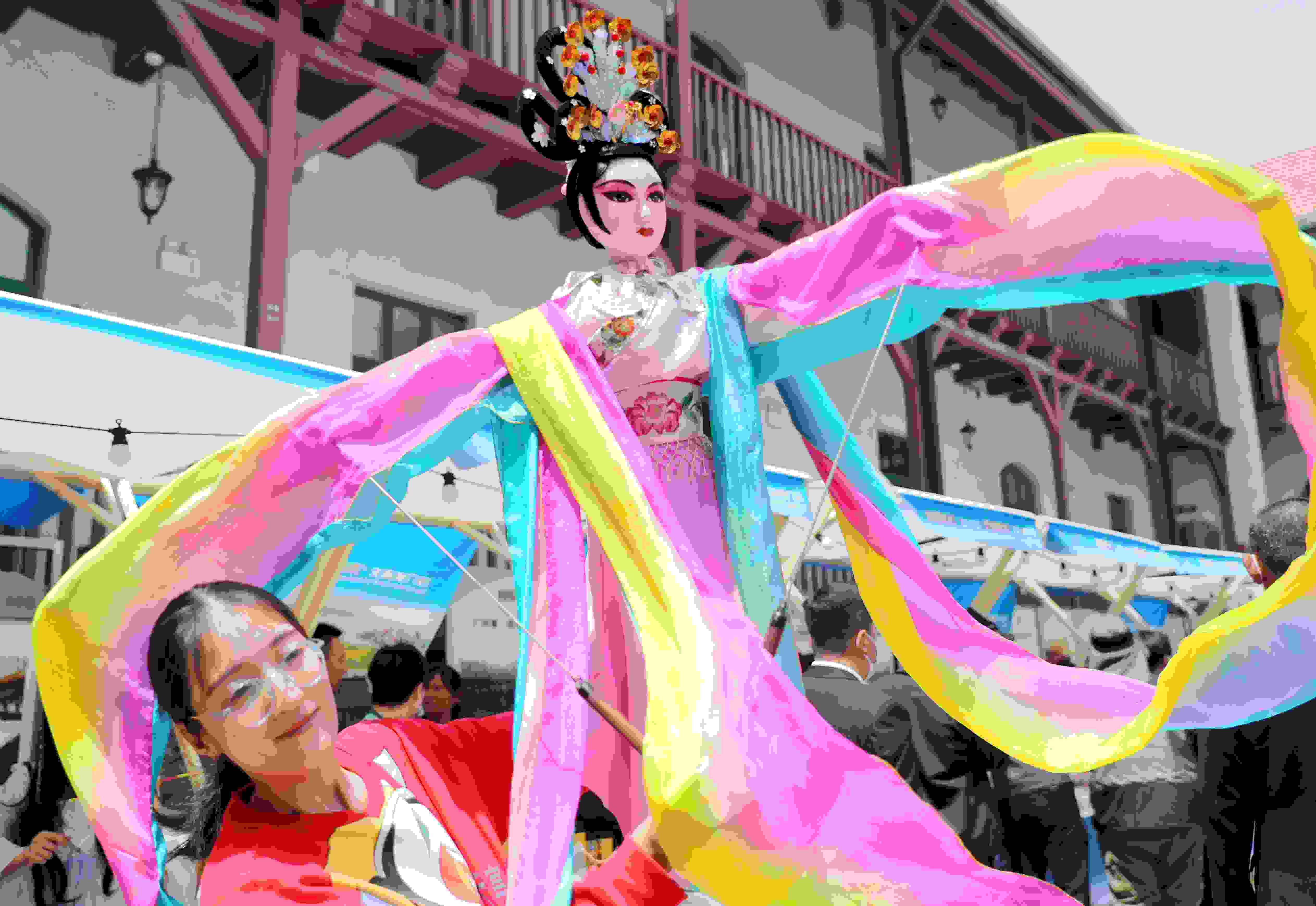 4月30日,山東萊西木偶藝術(shù)團的演員在給游人們展示木偶戲的表演技巧。 張進剛 攝
