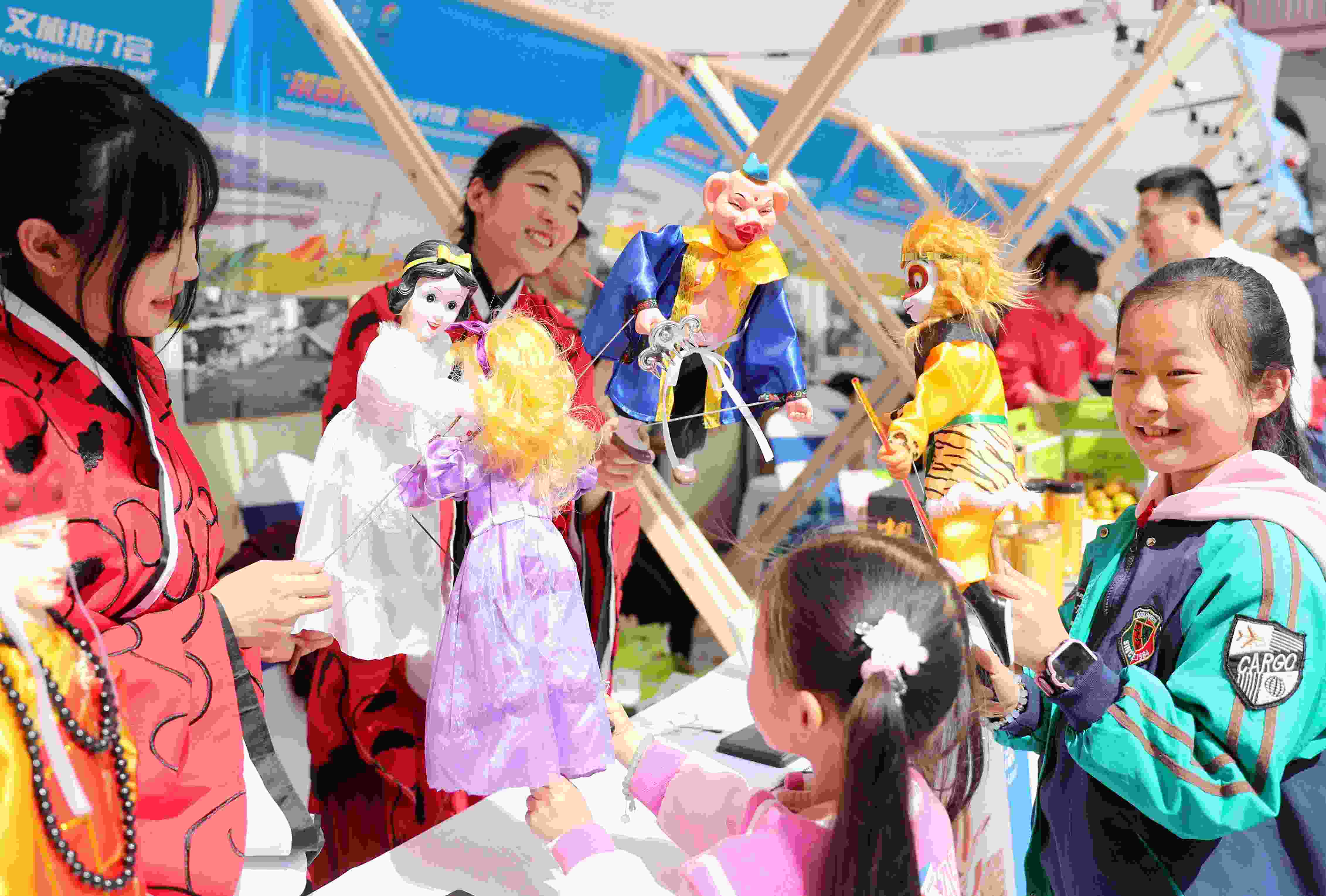 4月30日,山東萊西木偶藝術(shù)團的演員在給小朋友們展示木偶戲的表演技巧。 張進剛 攝