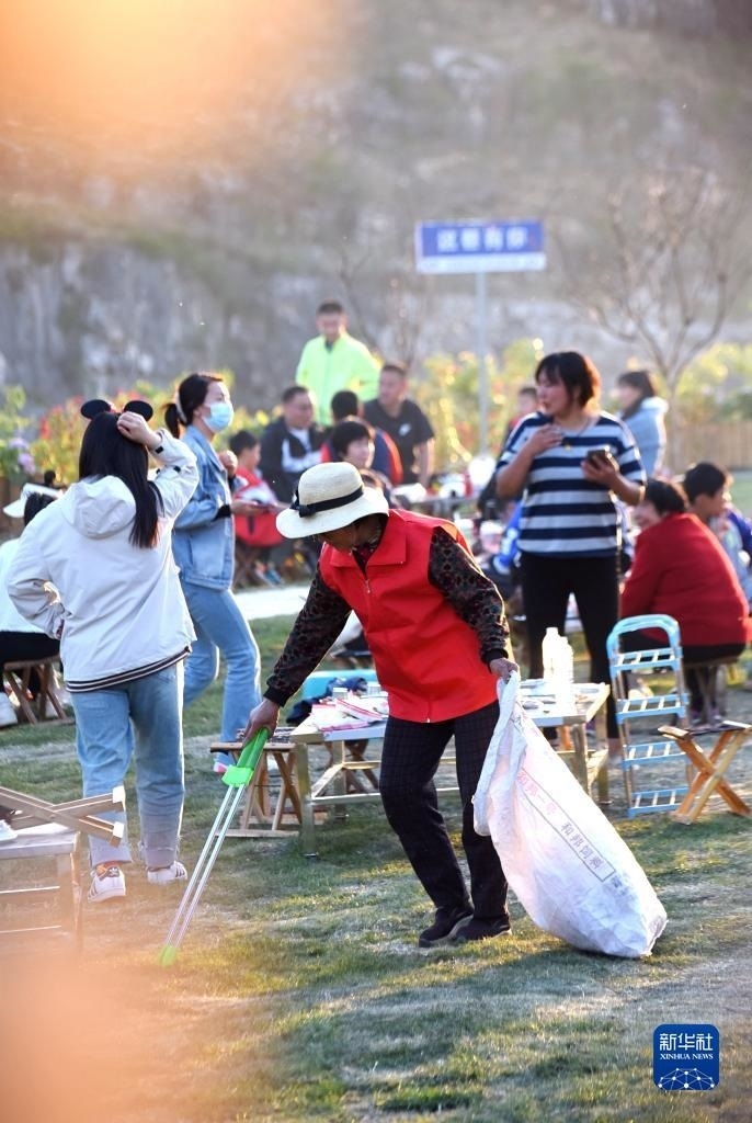 4月30日,在淄博市沂源縣悅莊鎮(zhèn)下龍巷村燒烤廣場,一名志愿者在撿拾垃圾。