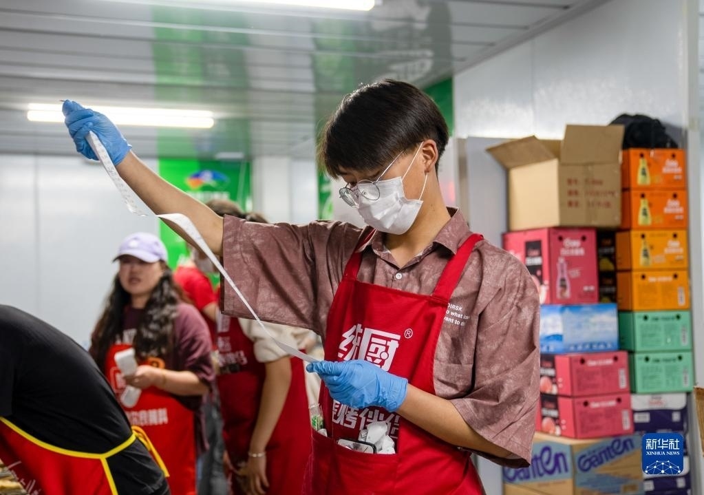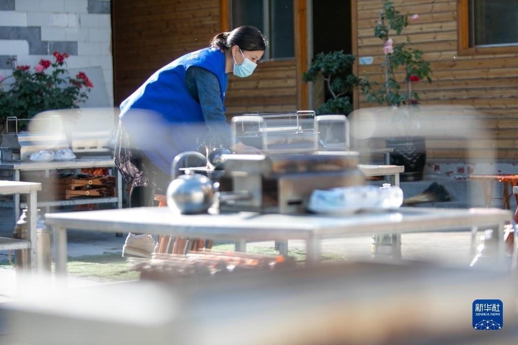 4月30日,一名社區(qū)工作者在淄博市高青縣田鎮(zhèn)街道幫助燒烤攤主擺放餐具。