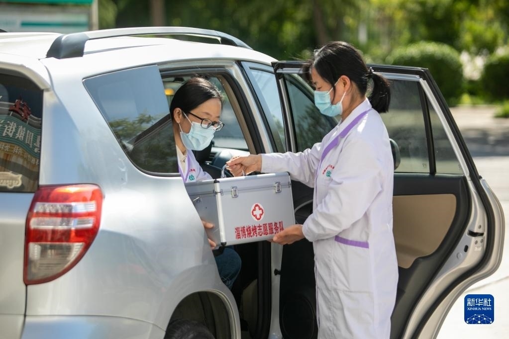 4月30日,在淄博市高青縣田鎮(zhèn)街道,志愿者備好常用藥品準備乘車前往一個燒烤服務點工作。