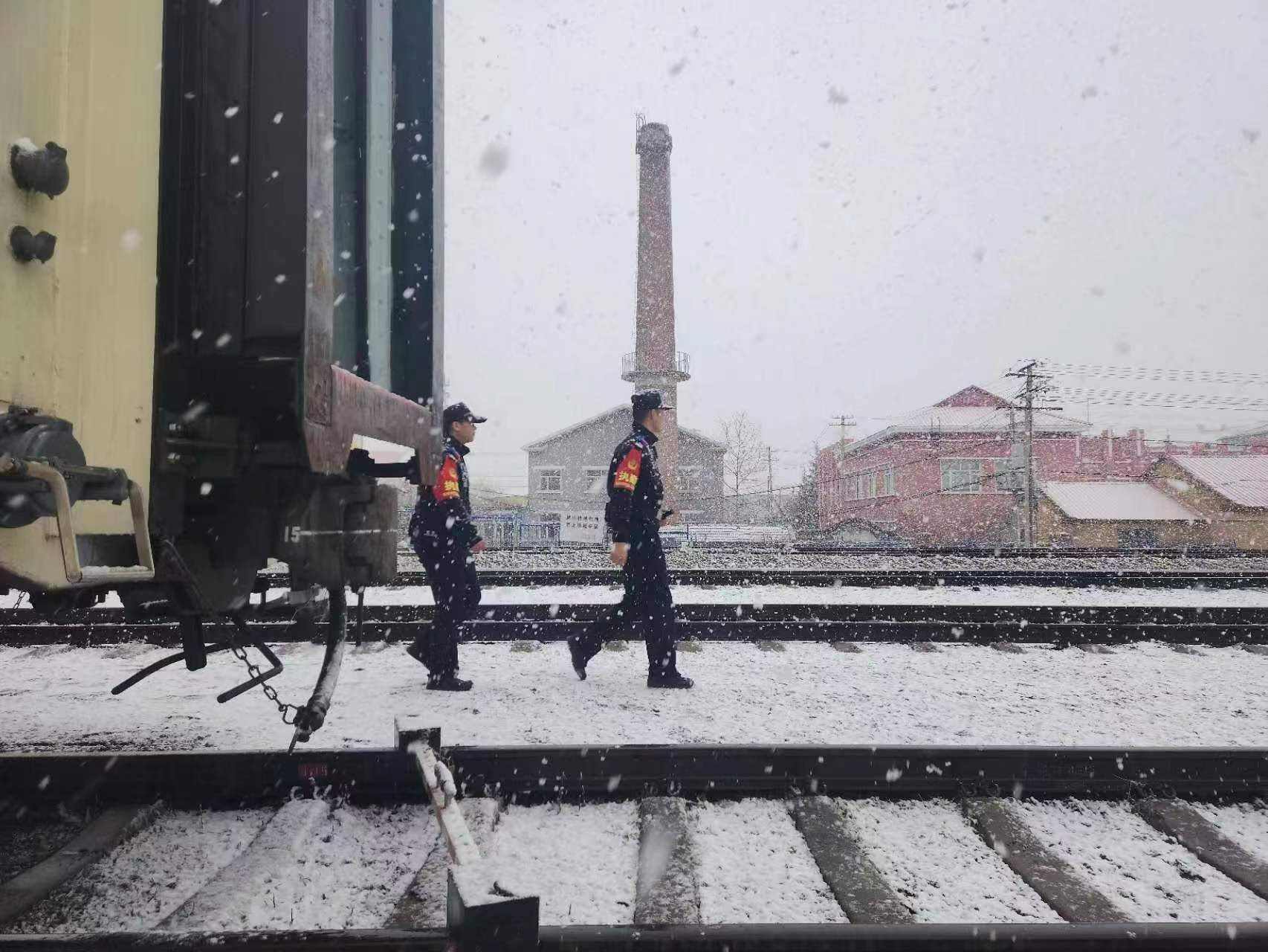 2023年4月30日,內蒙古自治區(qū)根河市,海拉爾鐵路公安處根河站派出所民警在風雪中巡邏。五一假期,位于大興安嶺深處的根河市迎來降雪天氣,根河站派出所民警在風雪中堅守工作崗位,確保旅客出行安全。 張磊 攝