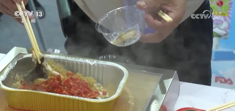 最受歡迎的莫過(guò)于預(yù)制菜的展位,熱辣的川菜、清淡的粵菜、精致的中式點(diǎn)心,還有各地的特色小吃,各種菜品應(yīng)有盡有。一加熱,香氣四溢,引來(lái)不少外國(guó)客商試吃。