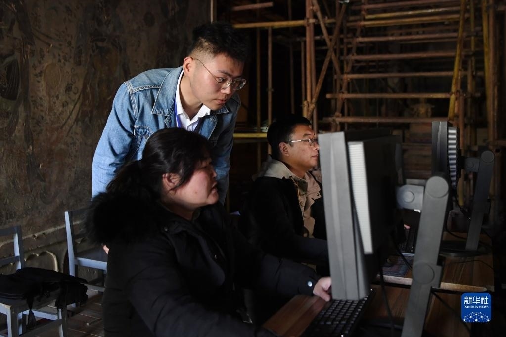 敦煌研究院文物數(shù)字化保護團隊圖像采集人員熊業(yè)騰(中)和同事在洞窟內(nèi)查看剛剛采集到的圖片(4月25日攝)。