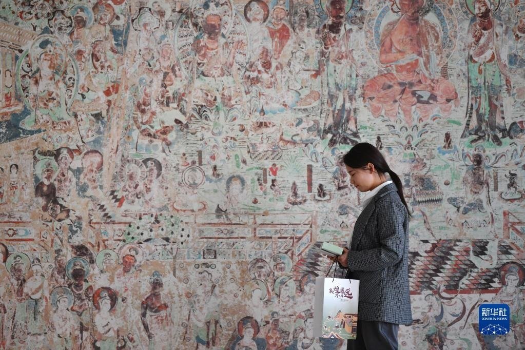 敦煌研究院文物數(shù)字化保護團隊創(chuàng)意營銷人員廖雪婷從一幅高保真復制壁畫前走過(4月25日攝)。