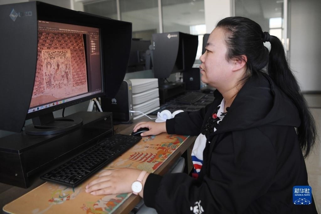 敦煌研究院文物數(shù)字化保護團隊圖像處理人員年海麗在拼接壁畫圖像(4月25日攝)。