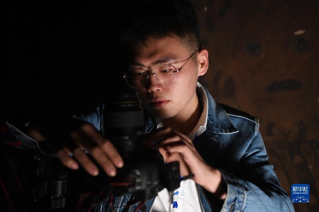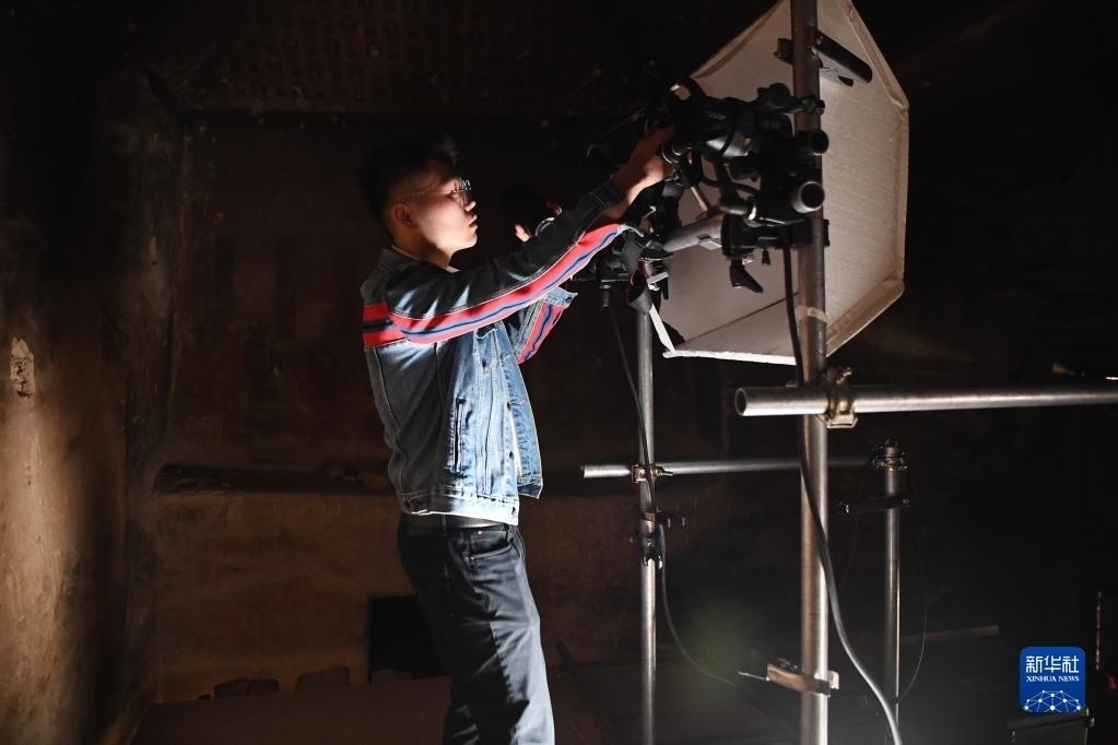 敦煌研究院文物數(shù)字化保護團隊圖像采集人員熊業(yè)騰在洞窟內(nèi)調(diào)試設備,準備進行壁畫圖像采集(4月25日攝)。